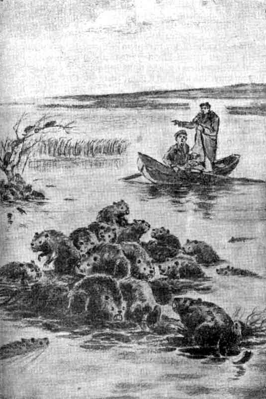 Весна в Сибири обычно наступает медленно, как бы подкрадываясь. В конце марта едва начинает пригревать солнце, затем оно, будто испытывая силу, посылает на землю свое горячее дыхание, и в первых числах апреля на высоких гривах появляются проталины. Проходит день-два, по-весеннему тёплых, налетает сивер и опять по степи заметает позёмка. И лишь в средине апреля весна берёт своё: с грив по склонам устремляются вперегонки ручьи, на открытых полянах начинают токовать тетерева, из-под только что сошедшего снега на пригорке появляются первые сибирские цветы — белоголовые подснежники. В этом году оправдалось предсказание деда Нестера: весна пришла ранняя и дружная. В начале апреля подул с чановской стороны южный ветерок, солнце стало щедро посылать свои лучи на землю — и зашумели по степи талые воды, прорываясь к займищам. Охотники вылезли из избушки и, усевшись на завалинку, подставляли обветренные лица навстречу ярким лучам солнца, обсуждали предстоящие дела. Благинин не утерпел, сходил на ближний, раньше других освободившийся из-под снега пригорок у берёзового колка, нарвал большой букет подснежников и принёс его Валентине Михайловне со словами: «Первые цветы, что первая любовь — всегда нежнее и дороже». Валентина Михайловна прижала к груди букет и, вдыхая тонкий запах подснежников, радостно воскликнула: — Хорошо-то как, Ванюша! Цветы… весна. Первыми растаяли мелководные плеса, появились за береги на озёрах. Природа ожила. Вернулись в родные края гуси и теперь, носясь парами и в одиночку целыми днями над займищем или собираясь стаей на образовавшейся в камышах полынье, оглушали карагольские отноги неугомонным гоготаньем; появились кряковые утки и, разбившись на парочки, перелетали с одного озерка на другое; высоко в воздухе часто проносились большие стаи шилохвостей, спешивших куда-то дальше, на север. С появлением тепла и ондатра через зимние отдушины и естественные проталины стала выходить на поверхность, а когда размыло у берега лёд, зверьки появились на его закрайке, грелись под солнечными лучами или лакомились сочными корневищами. С каждым тёплым днём на водоёмах становилось оживлённее. Зверьки гонялись друг за другом, затевали драки, поднимая шум и писк, сновали по воде во всех направлениях, выискивая себе подруг. Видя, как оживает природа, охотники спешили: конопатили и смолили лёгкие лодки, тесали из досок длинные шесты. Дед Нестер сколачивал последние заготовки живоловок. Приехал Жаворонков исообщил Покровской, пришедшей к охотникам: — Ну, Валентина Михайловна, берегись! Письмо получил: учёный к нам едет. Он спросит с нас, чем мы тут занимались. — Учёный? — удивилась Покровская. — Откуда, с какой целью? — Из Москвы. Я сообщил в научно-исследовательский институт о нашей затее и просил совета. А институт решил послать сюда одного из учёных. Со дня на день должен быть… — Поедет сюда учёный, смотри-ка, — заметил Тимофей Шнурков. — Кому это нужно по нашим болотам шариться, или худо ему там, в Москве, в белом халате в бирископы заглядывать. — Может, в микроскопы, — поправил его Ермолаич. — А почему бы и не приехать. Для науки и здесь дел много. — Пусть будет по-твоему: микроскопы, а только он не приедет. А приедет, так что толку-то? Полежит на бережку под зонтиком, да и поминай как звали. Уж я их знаю. Ещё при царе Николашке приезжал