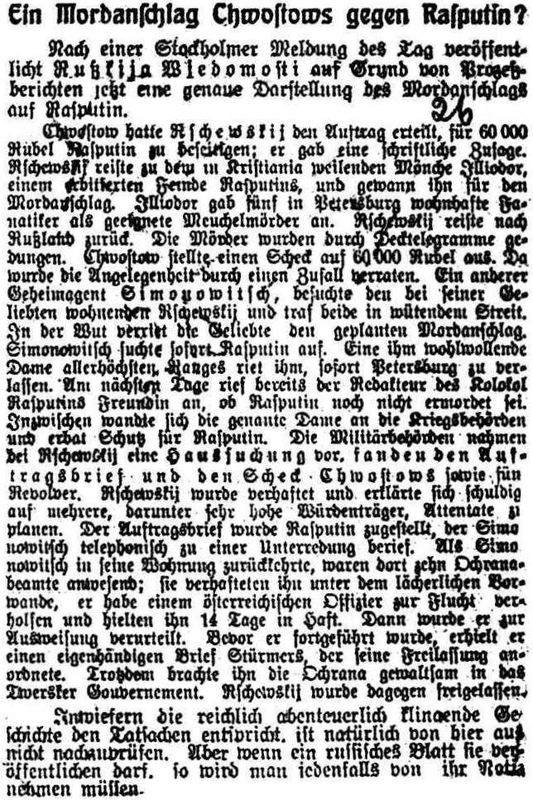 Спланированное русским министром внутренних дел Хвостовым покушение на Распутина в освещении немецкой прессы.