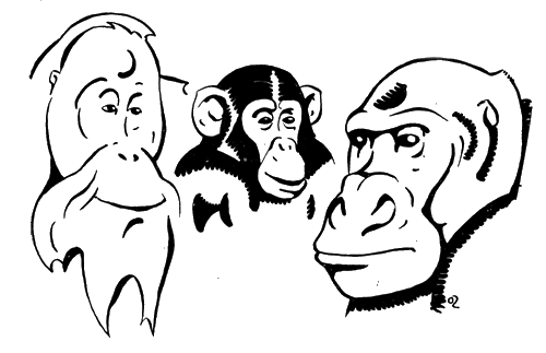 Человекообразные обезьяны: оранг-утан, шимпанзе и горилла (слева направо).