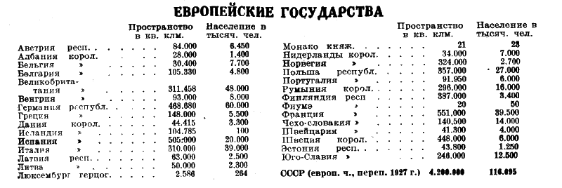 Несмотря на многочисленные кровопролитные захватнические войны, которые велись на протяжении веков, а, возможно, и благодаря им, в Европе удержался целый ряд курьезных маленьких государств, сохраняющих номинально свою «самостоятельность», хотя, экономически и политически, — и зависимых от своих более сильных соседей. Самым крохотным из этих государств является известное своей рулеткой княжество Монако, занимающее территорию лишь в 21,6 кв. клм., с населением около 30.000 человек. Несколько больших размеров республика Сан-Марино в центральной Италии. Территория этой республики—62 кв. клм., население — 12.500 человек. Княжество Лихтенштейн, на границе Австрии и Швейцарии, стоит на третьем месте. Поверхность его территории равна 159 кв. клм., населения около 11.000 человек. Затем следует расположенная на южном склоне Пиринеев, на границе между Испанией и Францией, республика Андорра, насчитывающая на 452 кв. клм. 5.300 жителей. На пятом месте стоит «вольный» город Данциг с территорией в 1.930 кв. клм. и населением в 386.000 чел., находящийся в таможенном союзе с Польшей. Это — государственное новообразование последнего времени, так как оно существует лишь с 1920 г. в силу Версальского договора. Ряд «карликов» замыкает великое герцогство Люксембург, на границе Бельгии и Германии, с территорией в 2.586 кв. клм. и населением свыше 261.000 человек. В совокупности все эти шесть карликовых государств занимают территорию в 5.210 кв. клм. или в шесть раз меньше Московской г., имея населения около 730.000, т.-е. почти втрое меньше, чем одна Московская губ., не считая самой Москвы.Б. В.