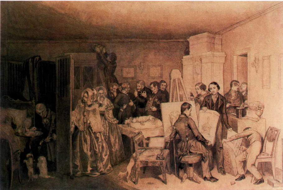 Между моментом выхода в отставку и первой живописной картиной Федотова располагается серия графических листов, выполненных в технике сепии. В разной степени совершенные, они сходны общностью художественной программы. Пожалуй, впервые и в чистоте принципа эта программа явлена в более ранней, выполненной тушью композиции Белъведерский торс (1841). Вместо всемирно знаменитого памятника античной пластики на подиум рисовального класса водружен не менее знаменитый в одной, отдельно взятой стране памятник питейного искусства - водочный штоф. Ввиду этой подмены внимание, естественно, приковывается к каждому эпизоду, дабы уяснить, что они там колдуют около своих холстов, что же они «изучают». В этой композиции сформулирован первопринцип, по которому строится федотовская художественная вселенная. Роль «первотолчка», вызывающего ее к жизни, играет сюжетная коллизия, образуемая подменой возвышенного - ничтожным, серьезного - пустым. Священнодействие, каким является постижение тайн прекрасного в изучении античных образцов, разом превращено в буффонаду. Этот типично комедийный маневр особым образом программирует зрительское внимание, как то и бывает в буффонадах, когда наш интерес подогревается ожиданием, какой еще забавный номер выкинут комедианты. А это значит, что отдельный «номер», то есть эпизод, деталь получают самостоятельную ценность. Целое выстраивается как дискретное множество, серия таких «номеров», парад аттракционов.