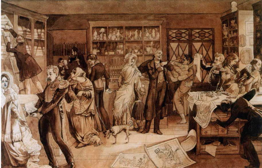 В сепиях присутствует пока еще эстетически не упорядоченная смесь правдоподобия с условностью сценического поведения и пантомимической режиссуры. Федотов вовсе не стремится уверить в том, что это «списано с натуры». Его цель иная: создать образ мира, где распались все связи, где все разорвано и каждая сцена, эпизод, фигура, вещь, по большей части, клоунским фальцетом кричит о том, о чем на высоте трагического пафоса вещал Гамлет, а именно, что «распалась дней связующая нить» и «мир вышел из пазов». Общий план, изобразительная стратегия сепий диктуются вовсе не нравственной озабоченностью и желанием открыть людям глаза на пороки городского общежития. Олицетворяющие эти «пороки» ситуации лежат на поверхности, да к тому же слишком расхоже известны, чтобы находить интерес в «открывании глаз» на такого рода элементарные вещи. Федотов создает не сатирические листы, а забавные картинки, удовольствие от которых предполагается в бесконечном нанизывании мелких казусов и деталей: лист из увража с памятником Байрону, который вынимает из папки мальчишка в качестве образца для надгробного монумента почившей Фидельке (Следствие кончины Фиделъки); мальчишка, который забавляется привязыванием бумажного банта к хвосту собачки (Кончина Фидельки); крендельщик приписывает на дверном косяке очередную строку в длинном столбце, документирующем долг клиента {Офицерская передняя) и т. п. Сюжеты листов опять-таки образуют связную серию, а именно - последовательность предельно высоких, священных «сущностей существования»: смерть, любовь, брак, слава. Но предстают они подернутыми житейской болотной тиной, утрачивая свою существенность и свой масштаб, сокращаясь до размеров того стакана, который обычно поминают в связи с соответствующего размера бурями. Смерть - это скандал по поводу околевшей собачки; любовь - это прельщение бедной девушки подарками прохожих ухажеров; брак - это нищета и скандальные сцены в доме художника, женившегося без приданого в надежде на свой талант, и - в пару к предыдущему - Первое утро обманутого молодого (1844-1846), обнаружившего, что богатство и «красота» невесты были поддельны и взяты напрокат; наконец, слава - это мелкое тщеславие получившего накануне первый крестик чиновника, в неопрятном виде красующегося в неопрятном интерьере перед своей неопрятной беременной кухаркой и сожительницей.