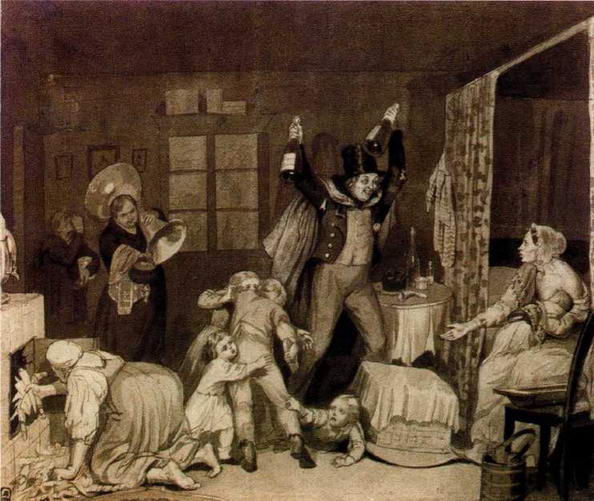 В сепиях середины 1840-х годов развивается тот же принцип: листы серии сопоставлены друг с другом, как номера большого аттракциона, коим является житейский театр. Составляется подробный перечень бытовых казусов, куда включены не только человеческие фигуры и диалоги, но и масса побочных эпизодов, «рассказываемых» вещами и обстановкой. Это нанизывание эпизодов в обычно развернутом, как сценическая панорама, поле действия, имеет тенденцию к бесконечному расширению, так что каждая сепия, будь то Кончина Фидельки, Офицерская передняя или Первое утро обманутого молодого (все - 1844), стремится к бесконечному разрастанию. Можно мыслить перестановку эпизодов, их сокращение или добавление. Пространство обычно разделено перегородками на множество отдельных ячеек. В прорывах дверных порталов на пороге этих пространств обязательно происходят сценки, создающие эффект срастания того, что происходит здесь, с тем, что происходит за порогом. В Кончине Фидельки в распахнутой двери справа отпрянул гимназист, пораженный скандалом, происходящим в комнате, тогда как слева отец семейства с бутылкой пунша и стаканом спасается во внутренние покои, отшвыривая подвернувшуюся под ноги собачку. В сепии Художник, женившийся без приданого в надежде на свой талант справа видно окно с дырой, где вместо стекла подушка, тогда как слева на пороге полуоткрытой двери - дочь художника в объятиях купца, предлагающего ей ожерелье. Во всех случаях событие, которому посвящено изображение, мыслится как некоторое сотрясение, посылающее «ударную волну» во все стороны и раздвигающее пределы пространства. Взрывоподобное действие страстей, которое смещает нормальные отношения, в самих фигурах выражается в преувеличениях карикатурного свойства: сильных мимических гримасах, агрессивной жестикуляции. Любопытно - в большинстве листов присутствуют неживые имитации живого: статуэтки, куклы, гипсовые слепки голов, ступни, руки, портновский манекен... В людскую жизнь вмешивается, ее пересекает другая, представленная в осколках, обломках, фрагментах, - образ сломанного, рассыпавшегося механизма и подобие того, во что грозит превратиться изображаемая людская круговерть.