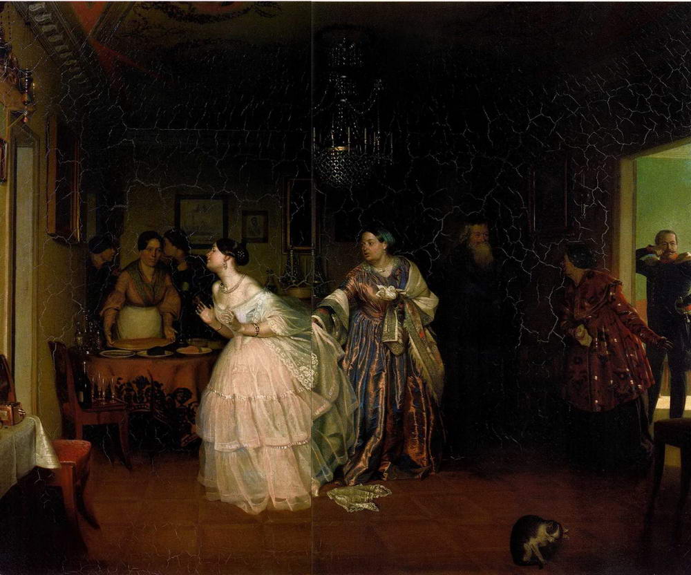 Неповторимая красноречивость этой картины - не красноречивость действительного эпизода, как бы списанного с натуры (как в Разборчивой невесте), а красноречие самого художника, приобретшего стиль, мастерство рассказа, умение перевоплощаться в своих героев. Здесь найдена тонкая мера художественной условности, связанной с законами сцены, со своеобразной сценической аффектацией поз, мимики, жеста. Тем самым снимается удручающий прозаизм действительного события, оно претворяется в веселый водевильный розыгрыш. В линейной партитуре картины варьируется «виньеточный» мотив. В эту ритмическую игру включаются и узор на скатерти, и украшения люстры, и зигзагообразные росчерки складок в платье купчихи, мелкое кружево кисейного платья невесты, выгнутые в такт общему узорочью ее пальчики и чуть манерный абрис плеч и головы, забавно отраженный в грации кошки, «намывающей» гостей, а также силуэт майора, конфигурация его позы, спародированная в изогнутых ножках стула у правого края картины.