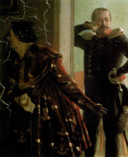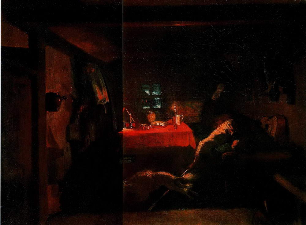 Изображается не событие, происшествие, а состояние, не имеющее представимого начала и конца; в нем теряется счет времени. В сущности, остановившееся время - событие на черте небытия - и есть то, чему посвящена картина. Этот внежанровый, траурно-мемориальный аспект темы проявлен в еще одном - полуфигурном - варианте (ГРМ): в геометризированной архитектурной статике композиции, повествовательном минимализме, строгом бестрепетном спокойствии, исключающем какой бы то ни было оттенок сентиментальности. Во Вдовушке неопределенная длительность изображаемого психологического момента исторгала ее из границ конкретно представимого времени. В картине «Анкор, еще анкор!» (1851-1852) временные границы растворяются мотивом действия - прыжками туда-сюда, словно маятник, мечущейся собаки. Они отсчитывают пустое, утекающее время. Время одновременно идет и стоит, поскольку не сулит никакого изменения реальности. Его движение иллюзорно. Эта ситуация сформулирована в названии картины, где русское «еще» обрамлено французским «анкор», означающим то же самое «еще». Экзотический фразеологизм, нелепица заволакивает, словно дымовая завеса, пустое, однообразно повторяющееся, вращающееся на месте, уныло прозаическое «еще, еще, еще» - понукания обезумевшего от скуки обитателя избы, заставляющего несчастного пуделя бесконечно прыгать через протянутый чубук. По тому же принципу построено живописное зрелище на полотне. Первому взгляду представляется нечто невнятное - колыхающееся дымно-душное марево; из него постепенно реконструируется элементарно-простейшее: свеча, стол, топчан, гитара, прислоненная к стене, лежащая фигура, тень пуделя и какое-то призрачное существо в дверном проеме в глубине слева. Люди и вещи превращены в живописные фантомы, какими они воспринимаются в зыбком промежутке между сном и явью, где кажущееся и действительное неотличимы друг от друга. Это двуликое, каверзное единство призрачного и действительного - одно из воплощений известной метафоры «жизнь есть сон».