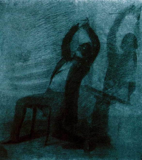 В давней акварели, изображающей Федотова и его товарищей по Финляндскому полку за карточным столом (1840-1842), драматургия карточной игры не составляет изобразительной задачи - создать групповой портрет. Вовлеченность в перипетии карточной игры, что называется, выводит из себя: тут не человек играет картой, а карта играет человеком, превращая лицо в олицетворение карточного случая, то есть в мистическую фигуру. Реальное становится воплощением иллюзорного. Именно такова общая тема, она же изобразительная стилистика картины Игроки. Вполне понятно, почему Федотов писал теневые фигуры игроков с манекенов: пластика статично-фиксированных марионеточных поз позволяла напомнить зрителю те состояния, когда, расправляя окоченевшее от долгого сидения тело - выгибая поясницу, потягивая руки, растирая виски, то есть приводя себя в чувство, - мы, в сущности, обращаемся с собой, как с мертвыми, извлекаем себя оттуда, где мы вели призрачное существование. Подобные ситуации выражаются общеупотребительной фигурой речи - «приходить в себя», «возвращаться к реальности». В любом из таких случаев существует переходный момент, когда душа пребывает «на пороге как бы двойного бытия». Быть может, в силу природной абстрактности графического языка (сравнительно с более чувственно конкретной живописью) в рисунках к Игрокам, выполненных лихорадочным, горячечным штрихом на бумаге холодного синего тона, соотнесенность таких вот двойственных состояний с миром запредельным, ирреальным выражена с более впечатляющей, чем в живописном полотне, пронзительной отчетливостью.