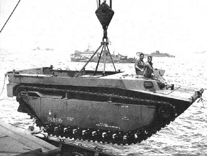 Погрузка плавающей гусеничной машины-амфибии LVT-4 на судно