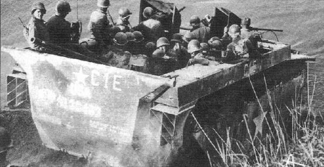Солдаты 3-го батальона 88-й пехотной дивизии армии США на LVT-4 переправляются через реку По в Италии. 24 апреля 1945 г.