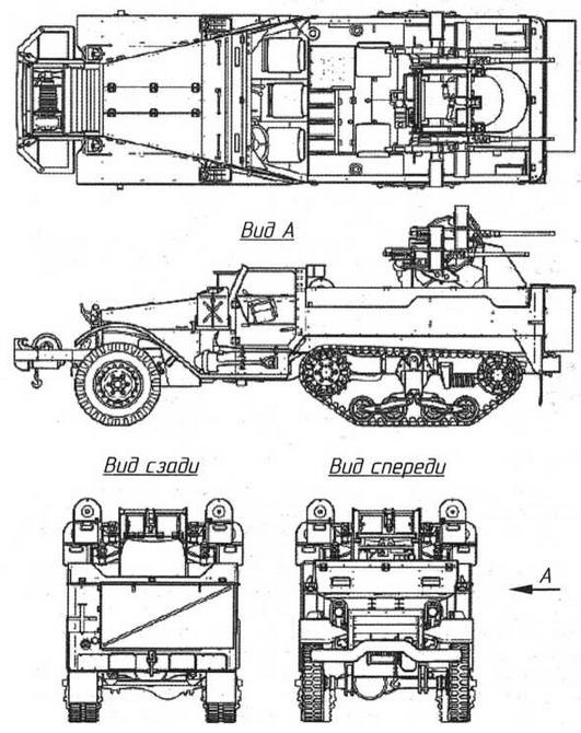 Основоположником американского семейства полугусеничных машин принято считать Half-Track Т1, построенную в 1932 г. фирмой James Gunniagham and Song в Рочестере (штат Нью-Йорк). В октябре 1940 г. на вооружение армии США приняли образец Т14 — полугусеничный БТР под обозначением М2 Half-Track Саг. После некоторых доработок его стали выпускать как М3 Half-Track Personel Carrier для перевозки личного состава. М2 был спроектирован и изготовлен на базе агрегатов гражданских грузовых автомобилей с использованием двигателя в сборе со сцеплением и коробкой передач, мостов, рулевого управления, агрегатов и приборов электрооборудования. Однако гусеничный движитель разрабатывался специально для БТР. Он состоял из двух передних ведущих колёс, двух направляющих колёс с натяжным механизмом, двух поддерживающих катков, восьми сдвоенных опорных катков с резиновыми бандажами. Гусеничная лента шириной 300 мм изготавливалась из металлических пластин, соединённых шарнирно. На пластины с обеих сторон была навулканизирована неразъёмная резиновая лента. На наружной поверхности гусеницы имелись грунтозацепы, на боковой — выступы для крепления траков противоскольжения. С их помощью М2 мог преодолевать снежный покров глубиной до 0,5 м.