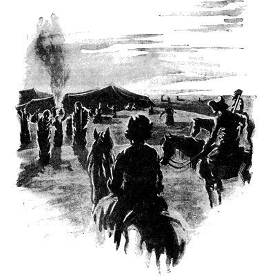 Мы подъезжали к арабским[30]) шатрам. Оранжевый огонек мотался среди черной мглы, облизывая большой котел, и отблески красного света прыгали по косым полотнищам темных палаток, припавших к земле, как крылья летучей мыши. Несколько женских фигур двигались около костра, поминутно закрывая его пламя.