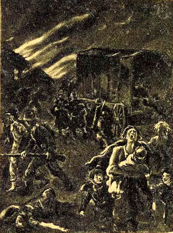 Зарево разгоралось. В зловещих кровавых отсветах его катился фургон, огромный, как дом на колесах. Ело тащили запряженные цугом лошади-великаны с длинными, развевающимися по ветру гривами, с косматой бахромой вокруг мощных копыт. Возница с дикими воинственными криками размахивал бичом, с непостижимой ловкостью сшибая мимоходом гуся или курицу с опаленными крыльями. Солдаты, марширующие по обеим сторонам, хватали на ходу убитую птицу и швыряли ее в раскрытую пасть фургона.
