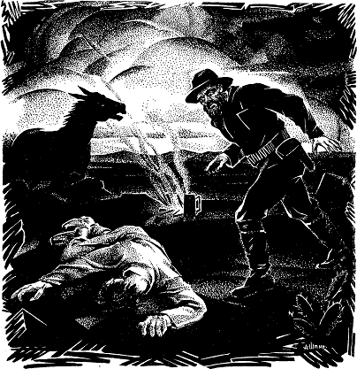 Рассказ Рейнгардта Рийка Рис. худ. А. Шпир Полуденное солнце немилосердно жгло средне-американскую песчаную пустыню. По этой земле кактусов, песка и почерневших скал, где нет ни дорог, ни тропинок, шло двое людей, гнавших перед собой навьюченного мула. Их снаряжение и, прежде всего, самое их присутствие в этой стране уже достаточно объясняло их профессию. Это были искатели золота, неутомимые искатели приключений. Но ни один из них не носил еще на себе резкого отпечатка этих настоящих «крыс пустыни». Вместо темного загара, который принимает кожа человека при долголетнем пребывании его в этой дикой местности, лица золотоискателей были красны и покрыты пузырями от странствования в течение нескольких недель под солнцем и ветром пустыни, а ладони рук покрылись от непривычной работы водянистыми мозолями. Один из путников, Джимми Хиггинс, более плотного сложения, ковылял позади своего товарища, тупо смотря себе под ноги. Черты его лица были отталкивающе грубы. Короткая густая черная борода начиналась чуть не от самых узко поставленных глаз. Шедший впереди него Пат Морган — тоже американец — был худощав и жилист. Во все время пути его глаза оставались настороженными, и иногда он оборачивался, бросая беспокойные взгляды назад. Тонкий, как пыль, белый песок пустыни покрывал густым слоем и людей и мула. Золотоискатели уже давно находились в пути и едва двигались от истощения. В течение двух последних часов они не обменялись между собой ни единым словом, — да и к чему было тратить силы на бесполезные проклятия! Каждый чувствовал, что только молчанием можно было как-то прикрыть взаимную злобу. А были достаточные основания, чтобы не показывать друг другу нараставшую ненависть… Шедший впереди Пат Морган, наконец, потерял самообладание, когда Джимми Хиггинс остановился, чтобы заняться своими израненными ногами. — Хорошенького спутника навязал я себе на шею. Слышишь ты, Хиггинс! А ведь вначале казалось, что тебе все нипочем. Какая глупость была итти с тобой через Сонору. Нет, будь я на твоем месте, я бы постарался как можно скорее убраться из этой местности. Когда Эван Нолан… — Попридержи глотку, Морган! Чтобы никаких имен! — прервал его Джимми, вскакивая с земли и сжимая кулаки, — уж второй раз ты произносишь это имя! — Иначе говоря, ты признаешь, что ты убил Нолана?.. — возразил Морган с раздражающим хладнокровием. — Я ничего не сказал, а только заметь себе: если у тебя есть какие-нибудь задние мысли, то лучше ступай своей дорогой и притом как можно скорее. — Задние мысли? Да мне-то что до этого? — натянуто рассмеялся Морган, желая успокоить расходившегося спутника. — Я сижу в луже так же глубоко, как и ты. Можешь не бояться, что я тебя выдам. Несмотря на это заверение, Хиггинс на всю дорогу погрузился в упорное, тягостное молчание. Хиггинс не терпел никаких шуток на эту тему. Всего каких-нибудь три недели тому назад он, Морган и некий Нолан составляли неразрывное трио. Эван Нолан был старым, опытным золотоискателем, и именно благодаря ему они напали на золотоносную жилу. В противоположность большинству подобного рода предприятий, они наткнулись буквально на золотое дно, которое дало им более тридцати тысяч пэзо, что составляло около двенадцати тысяч американских долларов. Но алчность искателя счастья пересилила в Хиггинсе здравый смысл. Во врем