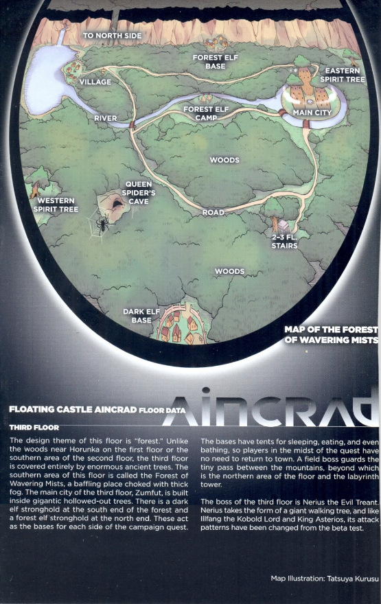 Первый этаж Айнкрада был создан в смешанном стиле, без какого либо общего дизайна. Местность была богата и разнообразна, с полями, лесами, пустырями и каньонами, не говоря уже о многочисленных небольших городках и деревнях за пределами Стартового города. Она создавала уютную атмосферу для новых игроков, но теперь, когда игра стала смертельной, только несколько человек были в настроении наслаждаться окрестностями.На втором этаже, однако, был очень четкий и единый дизайн. Земля была покрыта зелеными полями пастбищ, и горами с плоскими, многоуровневыми вершинами, а все местные монстры были животными разных видов. Как компенсация усилий, затраченных на прохождение первого этажа, дикая местность второго не была очень сложной, что в сочетании с визуальным стилем придавало этому этажу пасторальный стиль. По понятным причинам, большинство игроков называли его Коровьи земли.