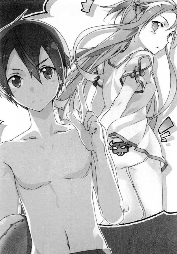 Почувствовав, что Асуна собирается развернуться, я быстро отвернулся и дважды нажал кнопку «Убрать снаряжение». Все мое снаряжение, в том числе и меч, перешло в хранилище, оставив меня в одном белье. Я был смущен, оказавшись в таком откровенном наряде перед очень красивой девушкой моего возраста, но темно-красные боксеры выглядели почти как плавки. Я успокоил себя, что все, о чем я беспокоюсь, находится исключительно в моей голове, а то, что можно увидеть, не было моим настоящим телом. Закрыв окно, я услышал странный звук «Пффффф». Осторожно повернув голову через плечо, я увидел Асуну зажимающую рот ладонью, а ее глаза метались из стороны в сторону. Это выглядело достаточно странно…