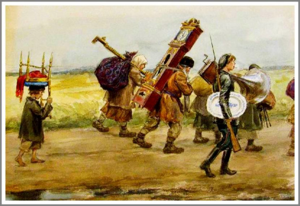 С насиженных мест. Крестьяне растаскивают имущество из барских поместий и отправляются в город в поисках лучшей жизни