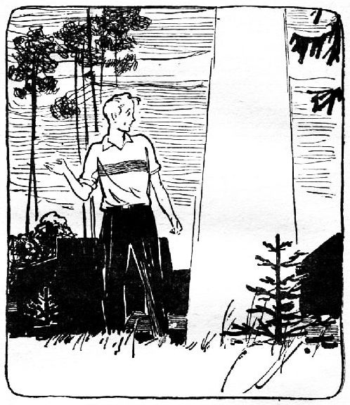 Поезд остановился в огромных кольцах. Белое днище одного из вагонов открылось, из дверцы показались ноги, затем весь человек. Чья-то рука поддерживала его. Он повис над травой, потом мягко спрыгнул, присел на корточки, тотчас встал и посмотрел наверх: — Все в порядке. — Не ушиблись? — раздался голос. — Нет-нет, все прекрасно. — Он помахал наверх рукой. — Спасибо! Дверца в днище закрылась. Поезд в магнитных кольцах двинулся и потек быстро, как сновиденье. Исчез. Человек проводил его взглядом, осмотрелся. Над кольцами, стоящими на опорах, едва слышно звенел утренний начинающийся зной. В кустарниках у дороги там и здесь лиловели гроздья поздней отцветающей сирени. Было тихо. — Запомним опору, — сказал человек. — Здесь вот этот раздвоенный бук, а рядом — муравейник. Он отошел от опор, быстро снял куртку, брюки и туфли, свернул все в комок, сунул в ямку под куст. Теперь он был в коротких облегающих трусах с карманом. На поясе в ножнах у него висел нож. Человек вынул его, пальцем попробовал остроту жала. — Угу! Он поднял руку, пошевелил пальцами, чувствуя, как тело покалывает свежий густой воздух. — Ну, пойдем. Дважды глубоко вздохнул, присел, выпрямился, тряхнул головой и пошел к лесу. Перед ним на столбике была табличка: