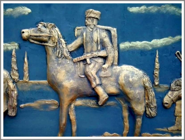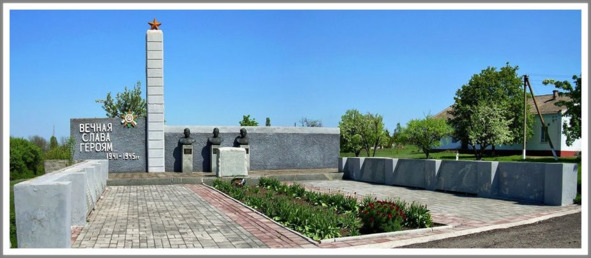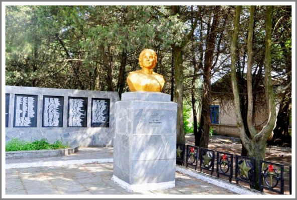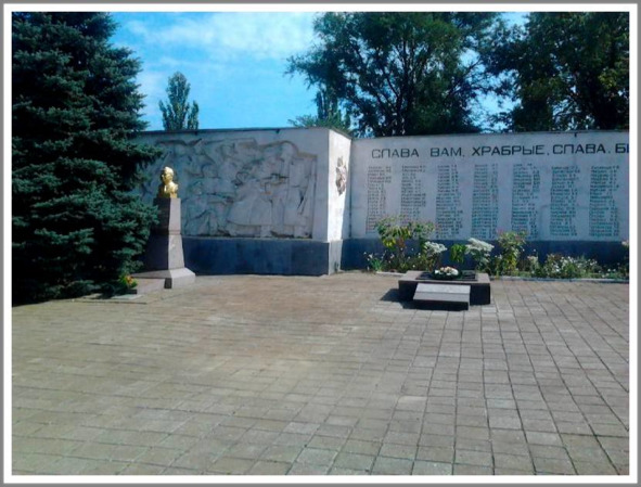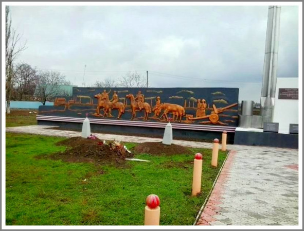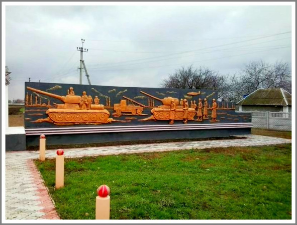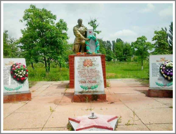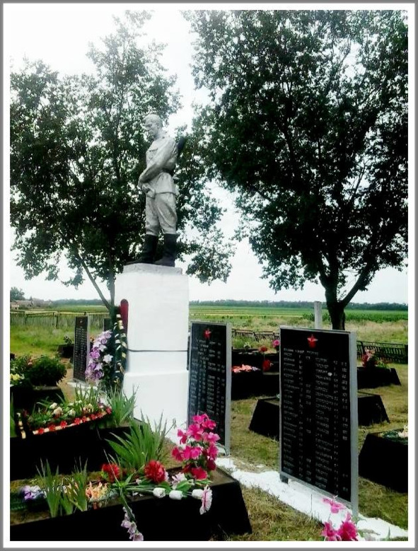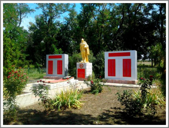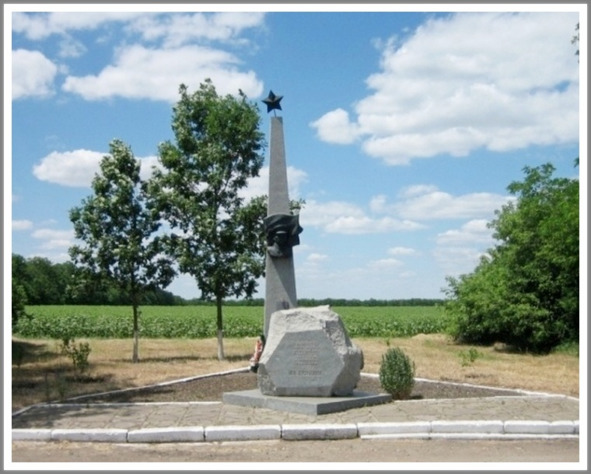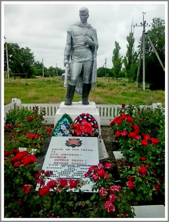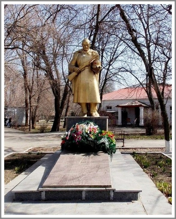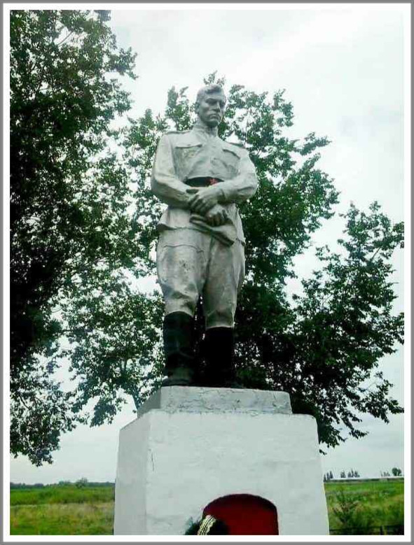 Памятник этот весьма своеобразный. Представляет он из себя грустного солдата, придерживающего левой рукой венок. Пребывая в великой скорби, солдат опустил глаза к постаменту, под которым покоятся его боевые, навсегда оставшиеся на той страшной войне сотоварищи.