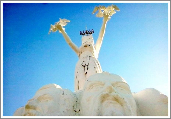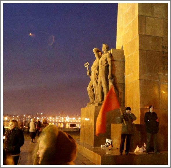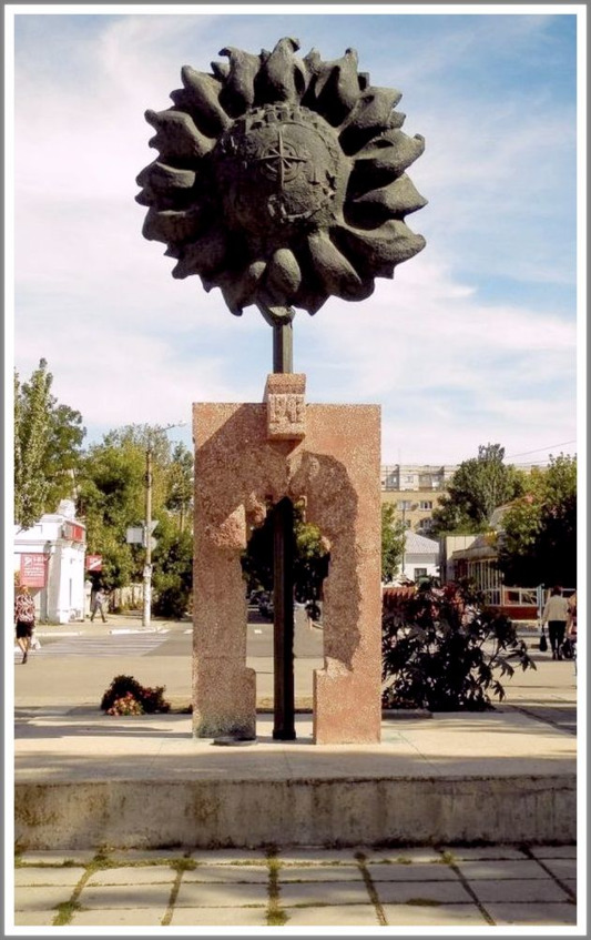Всю скульптурную композицию венчает пятиконечная звезда.