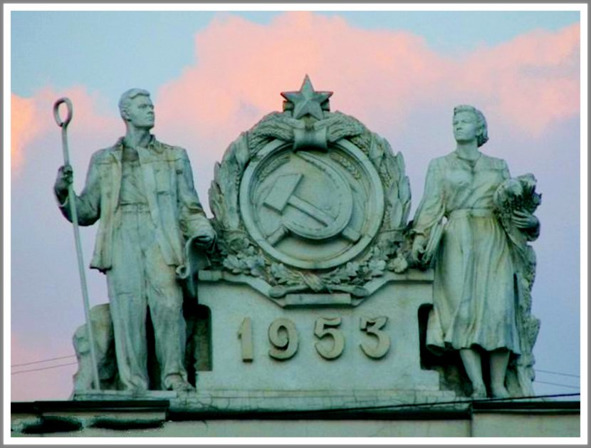 Обратили внимание, что за скульптурная композиция находилась на самом-самом верху здания? Это были рабочий [наверное, сталевар] и колхозница, придерживающие венок, в центре которого находились… серп и молот.