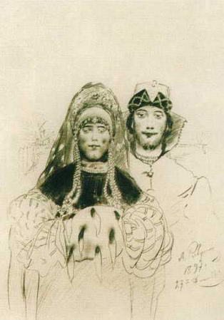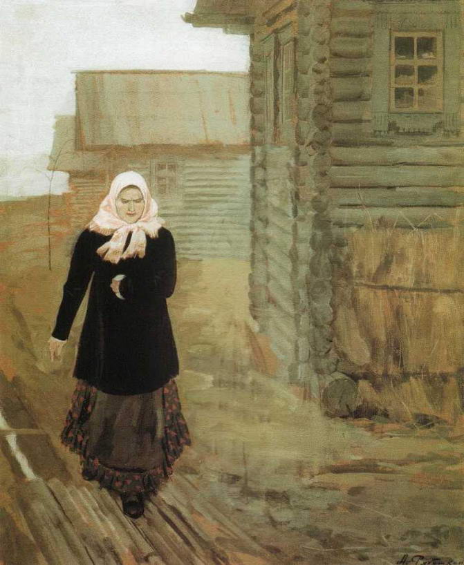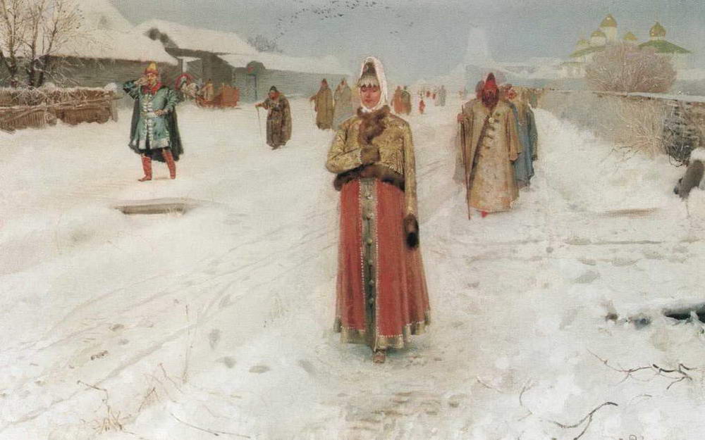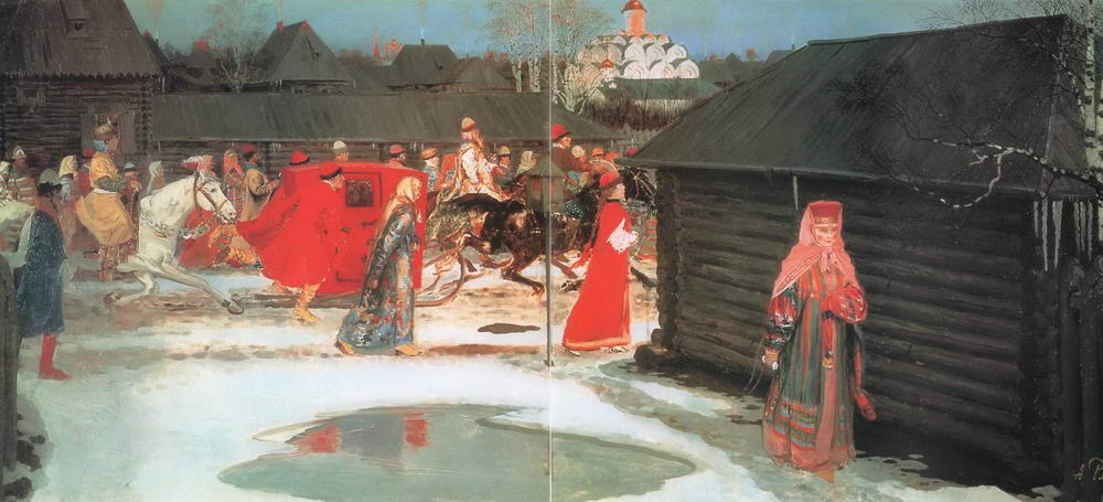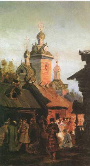 Впервые же на посмертной выставке появилась замечательная картина Московская девушка XVII века (В праздничный день). Стремительно проходит мимо нас, спешит куда-то московская девушка XVII века. Нежными тонами переливается ее красно-фиолетовая шубка, светятся желтые сапожки, развевается вплетенная в длинную косу красная лента. Своеобразной чопорностью веет от характерного профиля ее лица, степенной походки. Удивительная выразительность стремительного и в то же время плавного силуэта, тонкое изящество колорита, мягкая ритмичность - все это пронизано особым, почти музыкальным звучанием. Аналогична по композиции Московской девушке XVII века тоже небольшая картина Шуба с царского плеча, или, как она была названа в каталоге выставки «Мира искусства» 1902 года, где впервые появилась вместе с картиной Едут, Пожалован шубой с царского плеча. Так же идущая фигура заполняет картину, но голова повернута. Голова эта замечательна. Именно так наивно-грубовато, самодовольно должен был ухмыляться в подобном случае русский человек, живший в то время с благообразно-мужиковатым лицом, оправляя и приглаживая бороду. Очень хороша живопись этой картины, особенно самой шубы с красным узором по желтому. Любопытна следующая деталь: шуба написана широко, на вид реалистически, но выписанный сложный узор местами, особенно внизу, ближе к подолу, не гнется по складкам, не затенен в глубине их, а будто положен сверху написанного, чего совсем незаметно при общем впечатлении. Опять перед нами прошедший через реалистическое мастерство художника иконописный прием детальной и самостоятельной выработки орнамента, столь отчетливого в украшениях одежды на иконах.