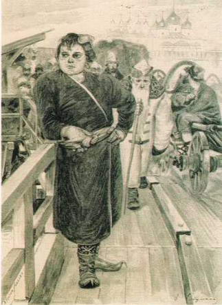 Деревянные и каменные постройки, киот с иконами на улице, возле которого сидит слепец с расписной деревенской чашкой, костюмы, узоры на тканях - все это не только верно, но и по-настоящему красиво. Степенно идет по бревенчатым мосткам пышно одетая красавица, на которую загляделся московский щеголь. Протяжно голосит сидящий у киота слепой нищий. Парень с простым крестьянским лицом, подобрав полы длинного кафтана, не спеша переходит грязную улицу. Бережно несет свечу возвращающаяся из церкви молодая женщина в белом платке. Ее лицо светится особой чистотой и ясностью.