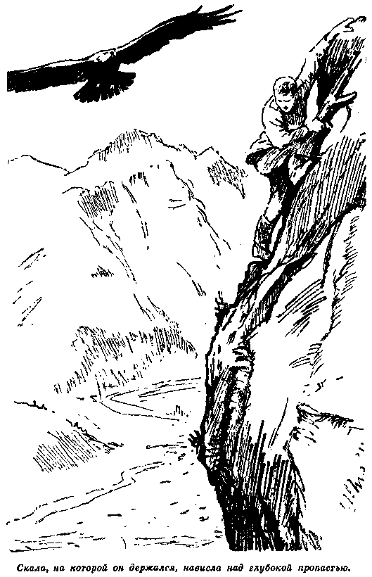 Еще плотнее прижавшись к скале, Петр повернул голову вправо: на снежной вершине сумрачная, темно-синяя туча - верный признак приближающейся грозы. Поглядел вниз и невольно зажмурился: скала, на которой он держался, нависла над глубокой пропастью. На дне ее серебрился под солнцем неслышный с высоты бурный поток. Поборов чувство страха, Петр снова глянул в бездну. Метрах в семи под ним парил орел. Еще ниже и чуть правее, на небольшой скалистой площадке, темнело гнездо, сложенное из хвороста и сухой травы. На краю гнезда что-то ярко зеленело. Увидев орла, Петр еще отчетливее ощутил исключительность своего положения: орлы строят гнезда лишь в самых недоступных местах. Но что это там зеленеет? «Фуражка! Моя фуражка!»