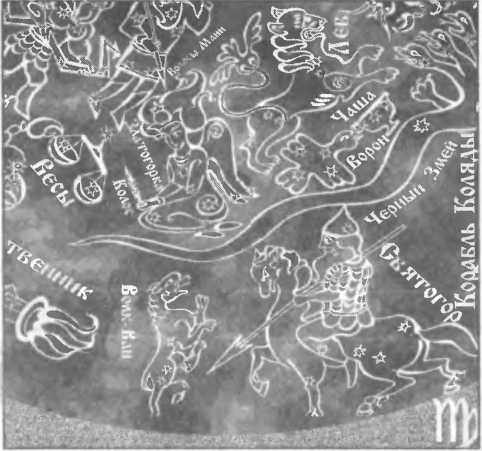По-древнерусски «слень» — особые слова, означающие понятия. В славянском звездоведении употребляются слова, смысл коих нужно разъяснить, прежде чем приступить к изложению самого учения. Коло Сварога. С давних пор в Древней Руси волхвы-звездочёты наблюдали за небом, которое уподобляли колесу, именовали его Коло Сварога. По представлениям славян, вращает Коло Сварога бог Перун. В «Книге Велеса», в «Прославлении Триглава», сказано о Перуне: «Ты, оживляющий явленное, не прекращай Колы-Колёса вращать!» Небо-Сварга виделось сложным устройством (чигирем, см. ниже), в коем вращается множество Колёс. Видно, что по небу двигаются не только звёзды, но и — сложным образом — светила, планеты (планиды), а также кометы (небесные змеи-угри). Все небесные тела имеют свои видимые пути, их движут Сварожьи Колеса. День и Ночь Сварога. Славянские волхвы ведали не только о суточном, годовом, но и об эпохальном (прецессионном) вращении небесного свода. Ведь Земля подобна волчку, который под воздействием сил тяготения планет Солнечной системы вращается сложным образом. Ось вращения Земли и сама вращается. И в результате Солнце в своём видимом движении ежегодно возвращается в точку весеннего равноденствия немного раньше, чем оно завершает свой полный оборот по Поясу Солнопутья. Поэтому Солнце, отмечаемое в момент весеннего равноденствия, медленно переходит из одного зодиакального созвездия