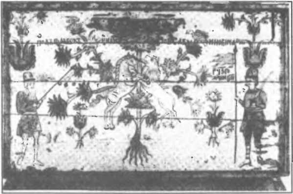И пошли скоморохи дальше. Видят: на реке красна девица полоскает в речке бельё. — Уж ты здравствуй-ка, красна девица! Бог на помощь тебе — полоскать бельё! — Вам спасибо на добром слове! Вы куда дороженьку держите? — Мы идём сейчас в Иноземье — переигрывать там Собаку! А и сына его Переплута, а и дочь его Перекрасу! — Пособи вам Бог, скоморохи! Чтобы вам его опозорить! И спалить собачее царство! Китоврас с Квасурой сказали: — Заиграй, Вавила, в гудочек! Во звончатый тот переладец! Китоврас с Квасурой помогут! Заиграл Вавила в гудочек, во звончатый тот переладец, приспособили скоморохи. А у той-то у красной девицы были все полотна холщовы — стали шёлковы и атласны. И пошли скоморохи дальше. И пришли они в Иноземье. Заиграл тогда бог Собака. Заиграл сын Дыя в гудочек, во звончатый тот переладец, — стала тут вода прибывать и топить гостей-скоморохов. Разлилась вода широко, подымалася высоко, скрылись в тех великих водах — рощи и долины, горные вершины… И воскликнули скоморохи: — Заиграй, Вавила, в гудочек! Во звончатый тот переладец! Китоврас с Квасурой помогут! Заиграл Вавила в гудочек, во звончатый тот переладец, приспособили скоморохи. И пошли быки тут стадами, да стадами и табунами, — стали воду ту выпивать, стала та вода убывать. Заиграл тут бог Переплут. И поднялись пред скоморохами горы и леса непролазные. И воскликнули скоморохи: — Заиграй, Вавила, в гудочек! Во звончатый тот переладец! Китоврас с Квасурой помогут! Заиграл Вавила в гудочек, во звончатый тот переладец, приспособили скоморохи, — загорелось царство Собаки и сгорело от края до края. И сбежал тогда бог Собака к Дыю-батюшке от огня. И тогда Китоврас со Квасурой посадили Вавилу царствовать. И женили на Перекрасе. И теперь все славят Вавилу! И Квасуру, и Китовраса, и Собаку, и Перегуду, и прекрасную Перекрасу!АЛИНА С ЛАНОЙ И ИЛЬМЫ ПЕРВЫЙ КЛУБОК ильмы и алина с ланой
