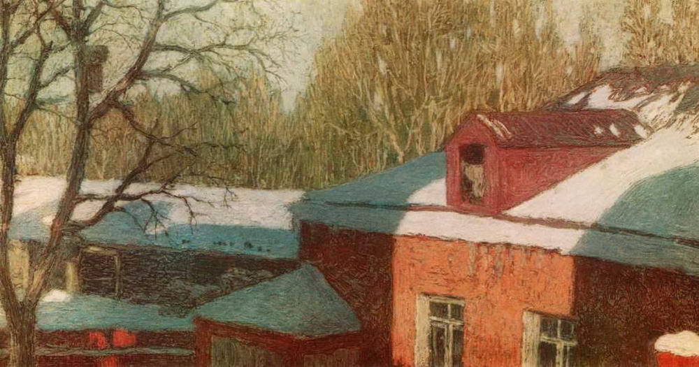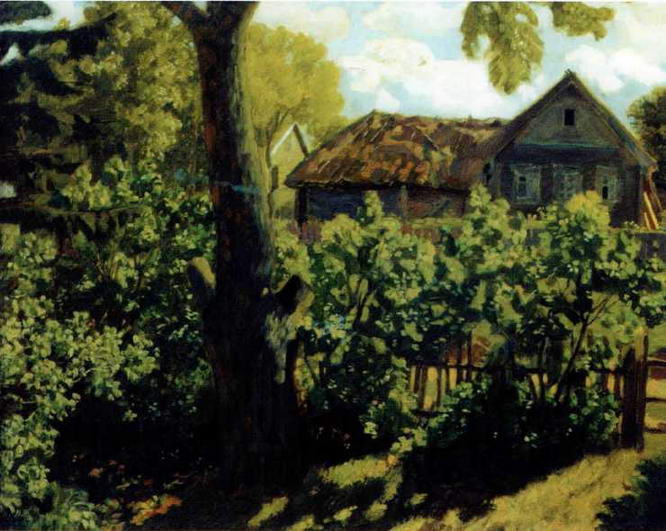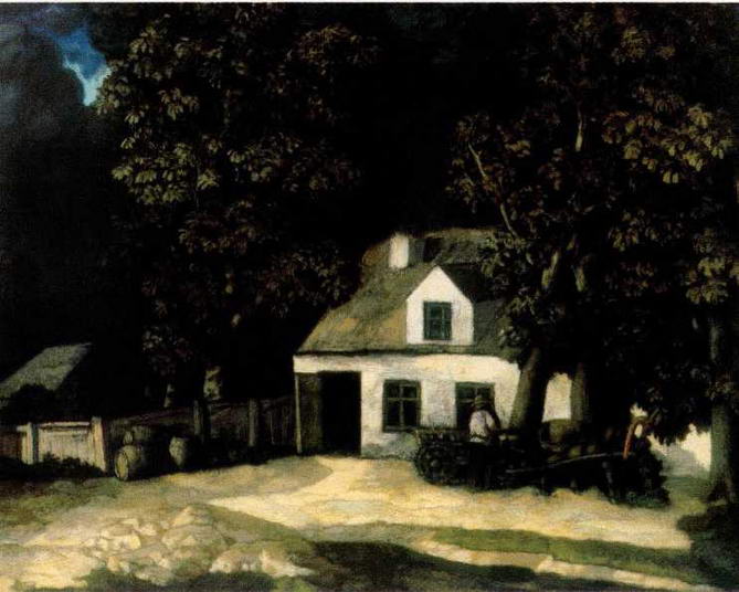 Сравним между собой трубу со стелющимся дымом, березовые слеги на крыше сарая и неприхотливые цветы на переднем плане и решим для себя, что в картине самое светлое. День, запечатленный художником, назван серым, но сам он нашел массу тонких оттенков этого цвета, столь любимого Врубелем и Серовым. Оттенки серого цвета - жемчужно-перламутровые, свинцовые и сиреневые, чередуясь, меняются на небе, как и форма быстро движущихся туч. Ощутим влажность воздуха после дождя и радость обновления природы. Понятие «частное» в этой картине переходит в понятие «общее». За левитановской обыденностью и внешней непритязательностью природы скрывается ее тонкая лирическая красота. А умение художника найти музыкальные, ритмические повторы выдает в нем неподражаемого мастера композиции. Желание проникнуть в тайны природы, постичь законы жизни, возникшее еще раньше в подмосковном Краскове, где Крымов проводил летние месяцы 1914-1916 годов, еще сильнее захватило художника в Звенигороде. Бывали у художника и сомнения. Его беспокоило, что-, обладая немалым творческим опытом, он идет как бы ощупью, не имея серьезных теоретических обоснований в работе. Однако ежедневная работа на натуре позволила художнику вывести стройную теорию. Летом 1926 года под Звенигородом художник решил написать заинтересовавший его мотив: в поле около дороги стоял белый дом, окруженный группой деревьев. Живописец обратил внимание на то, что освещенный дом смотрелся необыкновенно светлым. Чтобы написать его, пришлось употребить почти чистые белила, к которым Крымов примешал немного желтой краски, боясь загрязнить сделавшийся желтоватым от солнечных лучей цвет дома.
