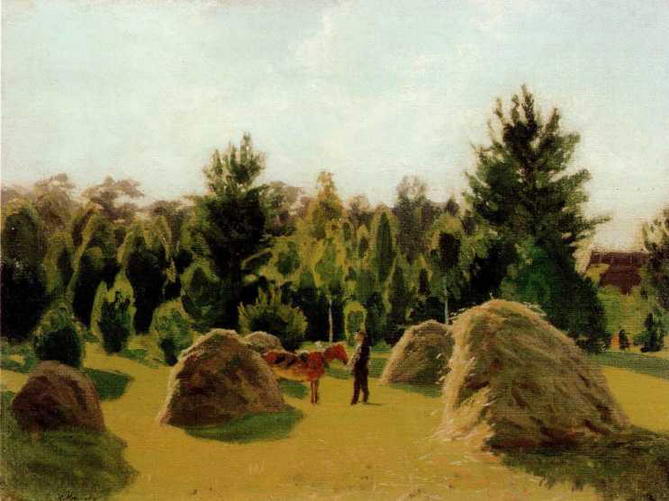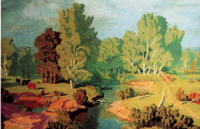 Крымов же назвал свое произведение незатейливо - Летний день. Оно дает зрителю возможность домыслить, дофантазировать, не лишая произведение достоверности. Приятная нега будто разлита по зеленому берегу, где расположились пять купальщиц. Их мягко светящиеся розово-золотистые тела, пронизанные солнцем и окутанные влажными испарениями, нежно контрастируют со светлой травой.Скользящие тени причудливо изукрашивают их. Композиционно они - объединяющее начало на полотне, но все же образ природы здесь является главным. Погружаясь в созерцание того или иного пейзажа, мы подчас забываем, что это название, происходящее от французского слова paysage, (а оно в свою очередь образовано от слова pays - страна, местность), означает такой жанр изобразительного искусства, в котором основным предметом изображения является дикая или в той или иной степени преображенная человеком природа. И если природа как таковая неизменна, то способов ее изображения множество. Пейзажи героические, эпические, романтические сменяют друг друга в той же последовательности, что и столетия. Смена вкусов и пристрастий в творчестве одного и того же автора позволяет увидеть его работы на протяжении десятилетий непохожими и изменившимися.