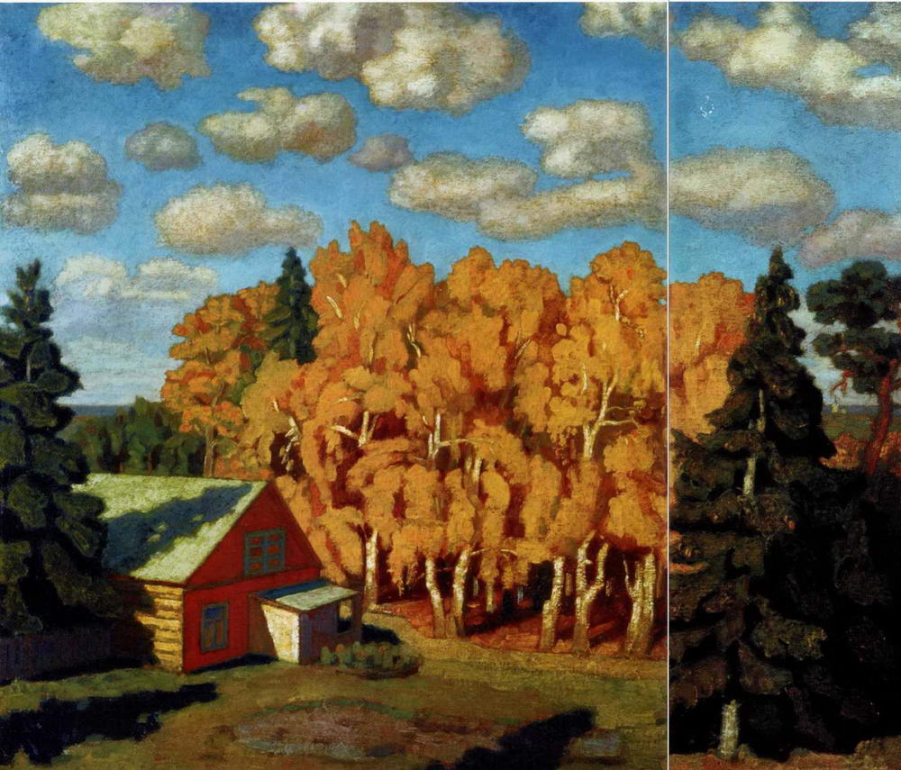 В неприхотливой по теме, но звучной и декоративной по цвету картине Осень Крымов оправданно смело использует традиции русской вывески, лубка. Лаконизм, ясность, скупость изобразительных средств точно соответствуют творческому замыслу. Казалось бы, далеко позади (в 1907-1909 годах) осталось творческое переосмысление художником того, что называют «примитив» в искусстве. Но элементы этого «наивного» видения мира очевидны. Лето 1917-1918 годов вся семья Крымова (он, жена, сестра, племянники) проводила в Рязанской губернии в имении Всеволода Мамонтова, друга Николая Петровича. Обычно, выбирая жилье на лето, художник всегда стремился найти дом, в котором был бы балкон на втором этаже, откуда удобно писать пейзажи. Вот почему в этой картине выбран «вид сверху», будто живописец низко летит над землей на сказочном ковре-самолете. Невысокий полет позволяет хорошо рассмотреть «игрушечный домик», хотя по определению это должна быть добротная деревенская изба. Яркий солнечный свет будто лишил его весомости, а бревна - тяжести. Неторопливое движение взгляда вдоль холста позволяет увидеть небольшую поляну в обрамлении елок, а на ней - уютное жилье и золотые деревья. Надо всем господствует поэтически-со- зерцательное состояние художника, позволяющее одинаково внимательно смотреть и на землю, и в небо. На натуре Крымов работал только летом. Но, несмотря на то, что зимние пейзажи написаны по памяти (исключения составляют «крыши», увиденные через окно) и в них присутствует элемент фантазии, они вместе с тем очень достоверны в передаче состояния природы, пейзажной среды, освещения и колорита. Зимние пейзажи художника, расположенные в определенном порядке, могли бы дать подробный в деталях и звучный по цвету рассказ об этом времени года: зима - время коротких дней и длинных вечеров; зима - невидимый глазу отдых природы и вполне ощутимая пауза для деревенских жителей между страдами; зима - время праздников и игр, но и время неустанных каждодневных трудов; зима - заботливая и опрятная хозяйка, укрывающая снегом всю непривлекательность неухоженной земли.