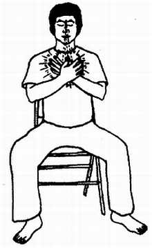 Передача Ци в сердце Сфокусируйте обе ладони на области сердца. Удерживая их таким образом, излучайте Ци в сердце. Почувствуйте, как сердце перемещается и расширяется вместе с грудной клеткой. Если вы чувствуете, что в сердце слишком много Ци, произнесите три раза Звук Сердца, чтобы избавиться от лишней энергии.