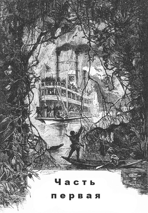 Само по себе местечко Пиколата особого значения не имеет, но окрестности ее богаты плантациями индиго, риса, хлопчатника, сахарного тростника и обширными кипарисовыми лесами. Весь район поэтому населен довольно густо. Пристань Пиколаты стоит к тому же на оживленном торговом пути, ведущем в Сент-Огастин, один из крупных городов Восточной Флориды. Сент-Огастин находится на расстоянии десяти — двенадцати миль от Пиколаты и расположен в той части океанского побережья, невдалеке от которого находится остров Анастасия. Пиколата с городом соединена почти прямою дорогой. В этот день на пристани Пиколаты пассажиров, дожидавшихся парохода, было больше обычного. Они прибыли из Сент-Огастина, и доставившие их восьмиместные дилижансы, запряженные четверкою или шестеркою мулов, мчались во весь опор по проложенной через болота дороге. Нужно было поспеть к пароходу, не то пришлось бы дожидаться по меньшей мере двое суток, чтобы добраться до любого населенного пункта — городка, местечка, форта или деревушки, лежащих ниже по течению реки. «Шаннон» обслуживал эти края отнюдь не ежедневно, а этот пароход в ту пору был единственным средством сообщения. Необходимо было, значит, поспеть в Пиколату к тому времени, когда «Шаннон» туда приходит; пассажиры были уже на пристани за час до прибытия парохода. В ожидании парохода на пристани Пиколаты собралось человек пятьдесят. Можно было заметить, что все они что-то возбужденно обсуждали, разбившись на две сторонящиеся друг друга группы. По каким же важным торговым или политическим делам они приезжали в Сент-Огастин? Во всяком случае, было ясно, что ни к какому согласию они там не пришли. Приехав врагами, они врагами и разъезжались. Это было видно и по той обособленности, с какой держались обе группы, и по сердитым взглядам и вызывающим словам, которыми они обменивались. Но вот послышались протяжные свистки, и из-за поворота реки в полумиле выше Пиколаты показался «Шаннон». Из двух его труб вырывались густые клубы дыма, расплывавшиеся над вершинами прибрежных деревьев, которые гнулись и раскачивались под --">