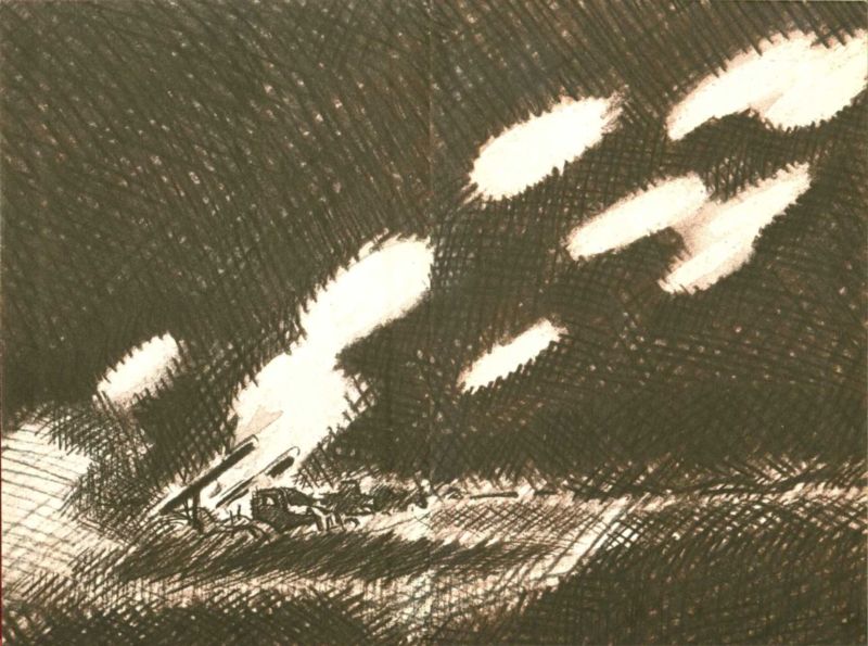 …В один ужасный день загудели сирены, фабрики, заводы, поезда. Над городом появились фашисты. Я был один дома. Я кинулся бежать ко Днепру, чтоб спрятаться в скалистых берегах. Вижу, по другой стороне улицы бежит моя мать. И вдруг промежду нами взорвалась бомба. Моя мать упала, но поднялась и побежала снова. Возле нее взорвались еще две бомбы. Мать опять упала, и гляжу — на этот раз ее ранило: кровь льется по лицу и по боку. Но она встала и побежала опять. Я был уже близко от нее, она мне кричала. И тут опять третий взрыв. Я упал, и мама тоже. Потом подошел, вижу — она уже мертвая лежит. Петя Коняев, 13 лет, из Могилева. Записано 10/11-42 г. в детдоме № 1, в Ташкенте.В четыре часа на рассвете