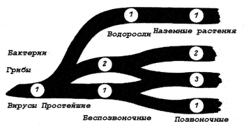 Рис. 1. Зависимость арсенала защитных механизмов, которым располагает биологический вид от его положения в эволюционно сложившейся иерархии видов. Системы иммунитета: 1 — конституциональная, 2 — фагоцитарная, 3 — лимфоидная