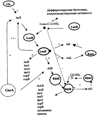 Рис. 9. Схематическое изображение регуляции генов патогенности Pseudomonas aeruginosa. Система сигналов las, передаваемых от «клетки к клетке», в иерархическом каскаде контролируется посредством сигнальной системы белка rhi Комплекс LasR/-3-oxo-C12-HSL активирует транскрипцию rhlR. 3-охо-12HSL блокирует активацию RhlR посредством C4-HSL. Сама las-система контролируется позитивно — посредством Vfr и GacA, и негативно — посредством RsaL. 3-oxo-C12-HSL требуется для дифференциации биопленки и обладает иммуномодуляторной активностью. Обе сигнальные системы регулируют экспрессию различных генов (lasB — LasB-эластаза; lasA — LasA-эластаза; toxA — экзотоксин А; аргА — щелочная протеаза хсрР и xcpR — гены хср-секреторного пути; rhlАВ — рамнозилтрансфераза, требуемая для продукции рамноллипида; rpoS — сигма-фактор стационарной фазы [Van Delden С, Iglewski В., 1998]