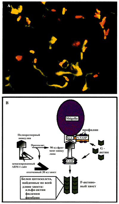 Рис. 10. Механизм инвазии Shigella flexneri. A. Иммунофлюоресцентная фотография, показывающая Shigella (темноевключение), проникающую через цитоплазму посредством полимеризованного актина (светлые нити). B. Перестановки цитоскелета, обусловленные инвазией Shigella. Наружный мембранный белок IcsA используется шигеллой для продвижения вклетку хозяина. IcsA непосредственно соединяется с двумя белками клетке хозяина — винкулином и белком нейрального синдрома Вискота-Аль-Дрехта (N-WASP). Шигелла расщепляет винкулин, в результате образуется 90 кд фрагмент, который присоединяется к IcsA и к вазодилататорстимулирующему белку (VASP). VASP рекрутирует белки цитоскелета клетки хозяина (актин и профилин) к бактериальной поверхности и формирует актиновый «мотор» для продвижения шигеллы