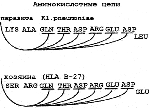 Рис. 12. Схема антигенной мимикрии между Kl. pneumoniae и HLA человека. Гомологичный участок Kl. pneumoniae и антигены гистосовместимости человека (HLA B-27) имеют 6 из 9 пар сходных аминокислот [Бухарин О.В., Усвяцов Б.Я., 1996]