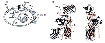Рис. 18. Стадии сибиреязвенной интоксикации. a.1 — РА связывается с рецептором клетки хозяина; 2 — фурин расщепляет и высвобождает ПА20; 3 — ПАб3 формирует гептамер; 4 — токсические ферменты связываются с ПАбз; 5 — опосредованный рецептором эндоцитоз; 6 — подкисление эндосомы приводит к мембранной вставке ПАб3; 7 — транслокация токсических ферментов в цитозоль. LF — летальный фактор; EF — фактор отека. b. Ортогональные проекции РА, окрашенного по доменам. Домен 1 включает РА плюс домен 1' и два иона Са2+. ПА20 отщепляясь, больше не играет роли в процессе интоксикации. Образовавшаяся гидрофобная поверхность домена 1' формирует участок связывания для LF и EF [Petosaet al., 1997]