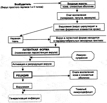 Рис. 24. Схема патогенеза простого герпеса. У большинства лиц с момента первичного инфицирования происходит пожизненная персистенция, находящегося в организме в латентном состоянии вируса. Под воздействием различных активирующих факторов, к которым относятся дефекты иммунной системы, вирус по аксонам выходит из нервных ганглиев, поражая участки кожи и слизистых оболочек, иннервируемые соответствующим нервом. По мере прогрессирования иммуносупрессии активация вируса становится все более частой, в процесс могут вовлекаться все новые ганглии, что приводит к изменению локализации и увеличению распространенности очагов поражения кожи и слизистых оболочек [Гавришева Н.А., Антонова Т.В., 1999]