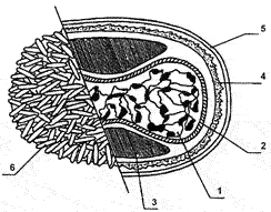Рис. 25. Структура внеклеточного вириона ортопоксвирусов. 1 — сердцевина, 2 — мембрана сердцевины, 3 — боковые тела, 4 — поверхностная мембрана IMV, липопротеидная оболочка EEV, 6 — трубчатые структуры поверхностной мембраны IMV.