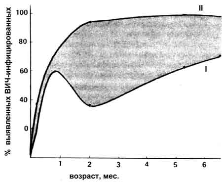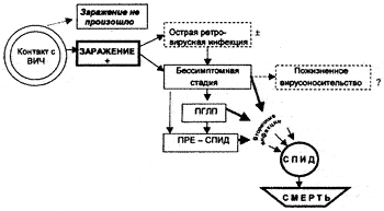 Любопытно проявление феномена апоптоза при взаимодействии клетки и паразита II типа. Оно полностью противоположно тому, которое демонстрирует ВНО и другие возбудители, использующие первую стратегию паразитизма. ВИЧ не располагает собственными генами, кодирующими белки, которые бы каким-либо образом участвовали в этом процессе. Однако инфицированные им CD4+ Т-лимфоциты при контакте способны быстро уничтожать такие же, но не инфицированные соседние клетки. Причем в условиях in vitro, этот процесс наблюдается до образования синтициев. Интересно, что цитолизу при явлениях апоптоза, подвергались как активированные, так и покоящиеся CD4+ Т-лимфоциты [Nardelli В. et al., 1995]. У ВИЧ совершенно противоположное, чем у ВНО взаимодействие с цитокиновым комплексом. Он не подавляет их, синтезируя растворимые рецепторы, а наоборот, индуцирует в ЦНС человека синтез самих цитокинов (TNF, интерлейкины) инфицированными макрофагами, клетками микроглии и астроцитами, тем самым, вызывая сильное нейротоксическое действие [Levy J.A., 1989]. В норме цитокины действуют в основном в месте локализации антигена. Их действие на уровне центральных органов иммунитета является быстротечным и импульсным. При ВИЧ-инфекции они продуцируются непрерывно, постоянно оказывая токсическое действие на организм человека [Лысенко А.Я. и др., 1996]. И уж почти мистически выглядит обоснованное предположение А.Я. Лысенко (1990) о преимущественной элиминации ВИЧ тех клонов Т-клеток, которые до инфицирования вирусом длительно накапливались в большом количестве как противодействие патогенному потенциалу популяций микроорганизмов-оппортунистов. Первоочередная селективная деструкция ВИЧ именно таких клонов Т-клеток, создает необходимые благоприятные условия для проявления оппортунистами своих патогенных потенций. Эти примеры наглядно показывают, что «захват власти над геномом хозяина» позволяет паразитическому микроорганизму изощренно и разнообразно противодействовать хозяину. Элиминация же CD4+ Т-лимфоцитов ведет к потере контроля над проникающими в организм возбудителями грибковых, протозойных и других инфекций, а также за трансформированными вирусом злокачественными клетками. По мере исчерпания резерва CD4+ Т-лимфоцитов и снижения концентрации вируснейтрализующих антител, у всех ВИЧ-инфицированных лиц формируется манифестная, четко диагностируемая по наличию характерных оппортунистических заболеваний, стадия — собственно СПИД (рис. 32).