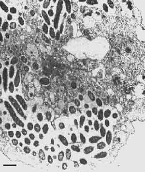 Рис. 70. Ультраструктурные доказательства присутствия Chlamydia pneumoniae в коронарной атероме. Трансмиссионная электронная микрофотография демонстрирует присутствие в ткани коронарной атеромы эндосом, содержащих С. pneumoniae — тельца грушевидной формы [Lee Ann Campbell et al., 1998].