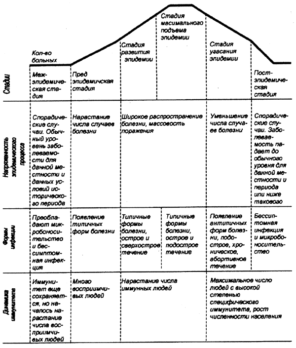 Рис. 63. Схематическое изображение стадий эпидемического процесса, вызванного микроорганизмом, использующим первую стратегию паразитизма. Границы между описанными стадиями условны, продолжительность стадий также может колебаться в широких пределах [Бакулов И. А. и др., 1997]. Эпидемии самоограничиваются в пределах отдельныхпопуляций, либо их приостанавливает активное вмешательство человека. Пандемия — явление качественно иного порядка, чем локальная эпидемия. На уровне субъективного восприятия каждая новая пандемия выглядит так, как будто она учитывает неудачи предыдущей и хотя бы на шаг опережает возможности науки данного исторического периода.
