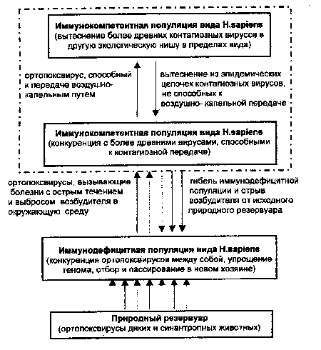 Рис. 66. Схематическое изображение возможного механизма формирования узкой специализации у возбудителя натуральной оспы и его отрыва от исходного природного резервуара.