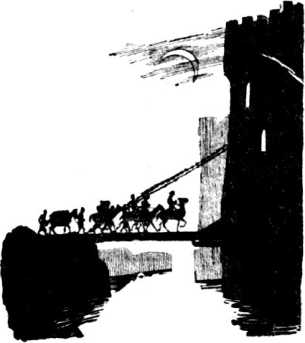 Было уже совершенно темно, когда издали на фоне ночного неба стал вырисовываться силуэт громадной стены. Перед самой стеной нас остановил широкий ров, наполненный водой. На другой стороне высились башни и ворота, такие же, какие я впервые увидел перед спуском в долину. Прозвучала труба и факелы замелькали на башне. Свет огня отражался на блестящих касках воинов. Они всматривались в нас с высоты башен. Потом послышался скрип и звон цепей: опускали мост.