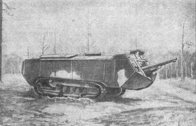 Для засекречивания новые машины были названы «артиллерийскими тракторами». Это звучит, пожалуй, менее удачно, чем короткое английское «танк». Первые две машины появились на французском танкодроме 15 сентября 1916 года, в тот день, когда английские танки пошли в первый бой. Одна из машин была построена заводом Шнейдера, другая — Обществом железоделательных и сталелитейных заводов. Очень скоро за ними укрепились названия «Шнейдер» и «Сен-Шамон». Обе машины представляли собой увеличенный по размерам трактор «Холт» с установленными на нем броневыми коробками. Характерной особенностью французских танков было то, что верхняя часть гусениц у них шла не поверх корпуса, как у английских, а под ним. От этого проходимость у французских машин была ниже, чем у английских. Вооружение «Шнейдера» состояло из короткой 75-миллиметровой пушки, помещенной в передней правой части танка, и из двух пулеметов Гочкиса по бокам. На вооружении у «Сен-Шамона» была тоже 75-миллиметровая пушка и четыре пулемета. Весили: «Шнейдер» — тринадцать с половиной тонн, «Сен-Шамон» — двадцать четыре. Четырехцилиндровый мотор «Шнейдера», помещавшийся в передней части машины, развивал шестьдесят сил. Наибольшая скорость танка достигала четырех километров в час. У «Сен-Шамона» мощность мотора — девяносто сил, наибольшая скорость — тринадцать километров в час. Для управления как одной, так и другой машиной требовался только один человек, а не четыре, как на английских танках. За первыми «Шнейдером» и «Сен-Шамоном» на французском танкодроме появились десятки других. Обучение танковых команд велось по той же приблизительно программе, что и у англичан. На поле боя французские танки появились на семь месяцев позже английских—16 апреля 1917 года. В этот день началось злосчастное «наступление» Нивеля. На танки в нем возлагалась задача прорвать третью линию германских окопов. Однако Нивель допустил ту же ошибку, что и Хейг: танки были пущены в бой в малом числе, разрозненно, на неподходящей местности и по непролазной грязи. Немцы встретили французские гусеничные машины сильнейшим артиллерийским огнем. Много танков было подбито; уцелевшие должны были повернуть обратно, не выполнив задания. Последующие действия французских танков были немногим более удачны. Еще в то время, когда «шнейдеры» и «сен-шамоны» находились на танкодроме и шло обучение их команд, полковник Этьен сообразил, что в дополнение к тяжелым пушечным машинам очень полезны были бы малые пулеметные машины. По предложению Этьена, конструированием подобного танка занялся французский автомобильный фабрикант Людовик Рено.