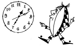 — По-моему, задача о часах очень интересная, — сказал Сева, — поэтому стоит разобраться в ней подробно. Магистр обнаружил, что часы его остановились во втором часу ночи, в то самое мгновение, когда часовая и минутная стрелки очутились на одной прямой, как бы продолжая одна другую. Он уверяет, что при этом секундная стрелка находилась перпендикулярно к часовой и минутной, образуя с каждой из них угол в 90 градусов. (Не забудьте, что у всех стрелок общий центр вращения.) Кроме того, Магистр утверждал, что часы его идеально точны. Но так ли это? Сева обвёл нас загадочным взглядом, потом начертил на песке палочкой окружность, разделил её на 12 равных частей и пронумеровал деления. Наверху поставил 12, внизу — 6, — словом, как на всех часах. После этого он прочертил две стрелки так, как их увидел Магистр: часовую — чуть дальше отметки 1, а минутную — на столько же дальше отметки 7. Все это он проделал весьма аккуратно, так что обе стрелки в самом деле оказались на одной прямой линии. — Секундную стрелку пока что чертить воздержусь, — продолжал Сева. — Теперь вспомним, что минутная стрелка делает полный оборот за один час, а часовой стрелке на это понадобится… — 12 часов, — ввернул Нулик. — Совершенно верно. Итак, угол, который отмеряет часовая стрелка, в 12 раз меньше угла, который за то же время отмеряет минутная. А теперь вернёмся к нашему чертежу.