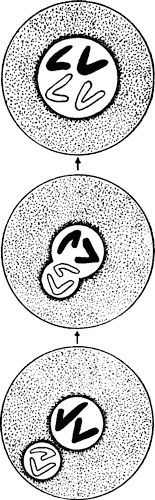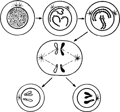 В последней четверти девятнадцатого века внимание ученых было обращено на клетку, в частности на главную и наиболее сложно устроенную часть ее — ядро. Техника микроскопирования в это время значительно усовершенствовалась, и уже никто подобно Гартсёкеру не мог «разглядеть» в головке спермия скрючившегося человечка, но зато обнаружили тончайшие структуры, о существовании которых и не подозревали. Особым вниманием исследователей пользовались хромосомы. Они представлялись им то нитями, то палочками, то спиралями, но во всех случаях интенсивно красились специальными красками, за что и получили свое название: «хромосома» означает «окрашенное тело». А потом наступил момент — и связан он был с именем ученого Бовери, — когда выяснилось, что нити, палочки и спирали — это разные стадии, разные этапы существования хромосом. Исследователь подметил, что маленькие окрашенные тела ведут сложный, на редкость упорядоченный образ жизни. Казалось бы, палочкой меньше или палочкой больше — не все ли равно? Но Бовери установил: в жизни клеток, в изменениях, происходящих с их хромосомами, все подчинено нерушимым законам, а направлены эти законы на то, чтобы ни одна «палочка», ни единый кусочек ее не исчезли, чтобы все в целости перешло от материнской клетки к дочерней. Покоящееся ядро выглядит шариком, в котором просвечивает сеточка окрашенного вещества хроматина. Кстати, тут же скажу: узаконенный в учении о клетке термин «покоящееся ядро» нужно понимать условно — именно в этой стадии происходят сложнейшие биохимические превращения, действуют гены. Но для микроскописта ядро в данный момент в покое. Однако приходит время клетке делиться, и ядро ее постепенно превращается в клубок нитей. Четко видны хромосомы, из которых ядро состоит. Вот они уже не окружены ядерной оболочкой и, кажется, беспорядочной кучкой лежат в клетке. Затем они выстраиваются по клеточному экватору, точно спортсмены, выровненные перед забегом на старте, и уже ясно, что каждая из них разделилась продольно, число их удвоилось. Потом, подхваченные тончайшими нитями белкового веретена, хромосомы начинают растаскиваться к полюсам клетки: разбегаются со старта в разные стороны, будто стояли до этого спиной друг к другу. У каждого из полюсов образуется новое, дочернее ядро, точь-в-точь такое же, как ядро материнское, из которого образовались дочерние ядра.