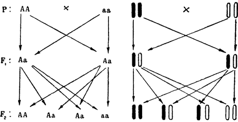 Схема Сеттона. Путь генов по Менделю (слева) и путь хромосом в поколениях. Внизу обозначены и гены и хромосомы.